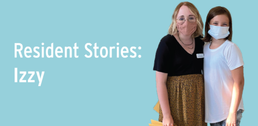 Izzy and a Mercy Housing Staff member smiling towards the camera while hugging, with the caption "Resident Stories - Izzy"