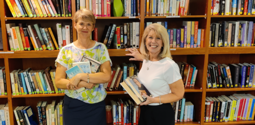 Two women organizing books on a book shelf, smiling towards the camera