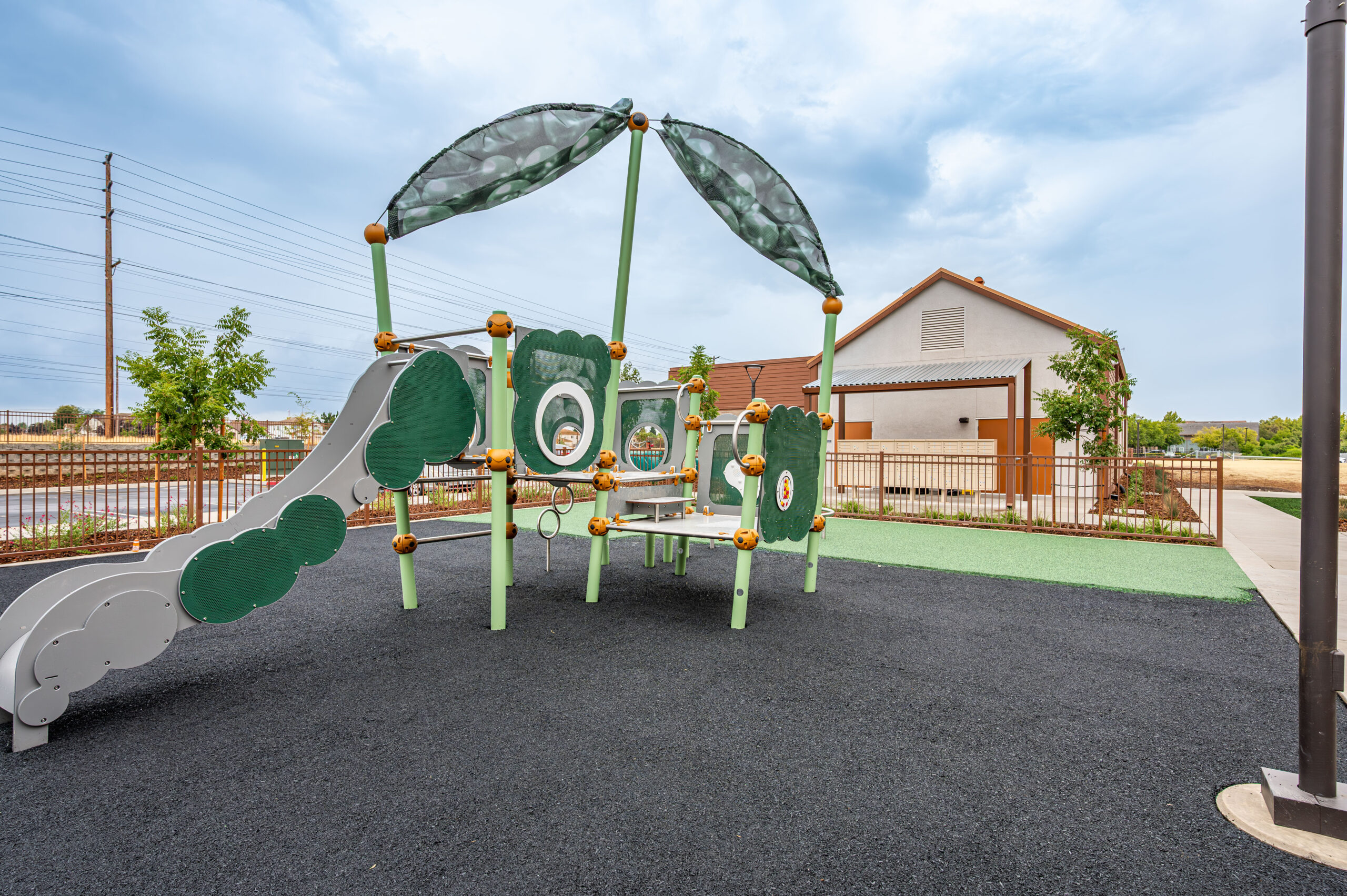 - Landscaped green space with walking paths and play structures